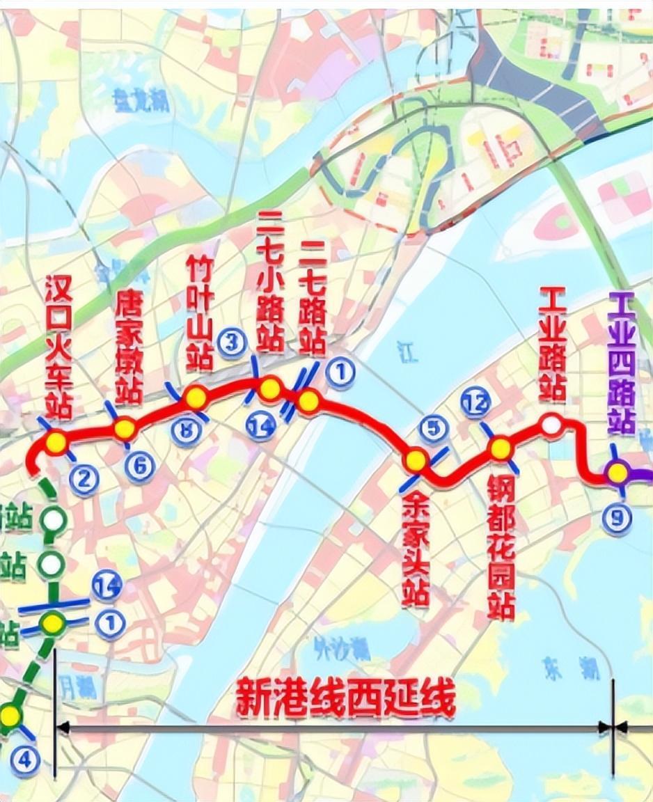 武汉地铁10号线新港西延线从工业四路直达汉口火车站,中途穿越长江,一共设置8个站点,分别是:工业路站、钢都花园站、余家头站、二七路站、二七小路站、竹叶山站、唐家墩站、汉口火车站等。为推动汉口二七滨江商务区发展,新港线西延线段(工业四路~汉口火车站)已经开工。新港线西延线,连接青山、武昌和汉口核心区,是武汉主城区一条重要的过江地铁线路,能够促进大汉口和大武昌地区经济和交通协调发展,提升武汉地铁骨干路网的运输能力,方便江城百姓出行。