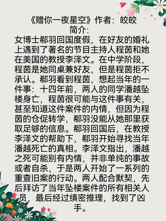 皎皎一贯的风格,人物设定依旧是遥不可及的学霸,作者文笔细腻,情节曲折,一个简单的自杀案竟变得扑朔迷离,故事推理丝丝入扣,本文的前半部故事缓慢展开,中后期描写让人疑窦丛生。