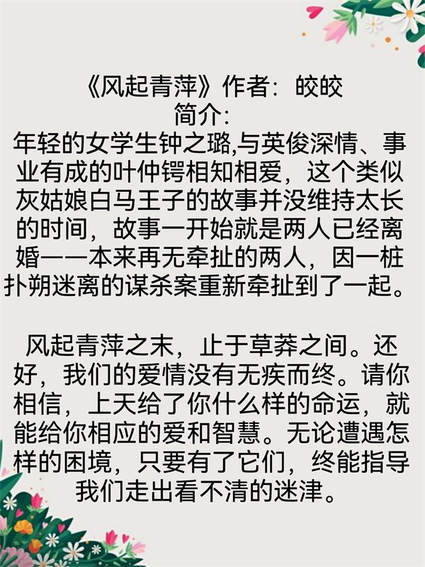 书评:男主叶仲锷,女主钟之璐,破镜重圆的悬疑文。