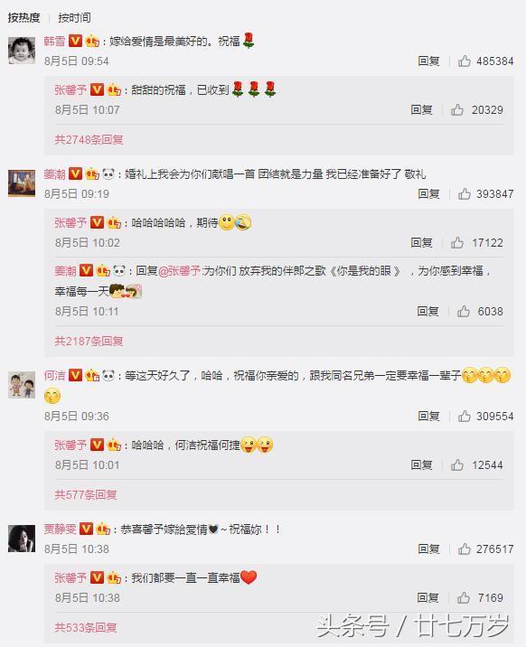 5日张馨予在微博上公布结婚的喜讯,瞬间成了爆搜。一向低调示人的张馨予,没想到和韩雪、贾静雯等女神都关系甚好,连沙溢这样的老干部也送来了祝福,这样的好人缘真的是不得不让人刮目相看!不过也有人说不是因为这些人多喜欢张馨予,只是他们看不惯fbb在娱乐圈一手遮天的猖狂劲儿。