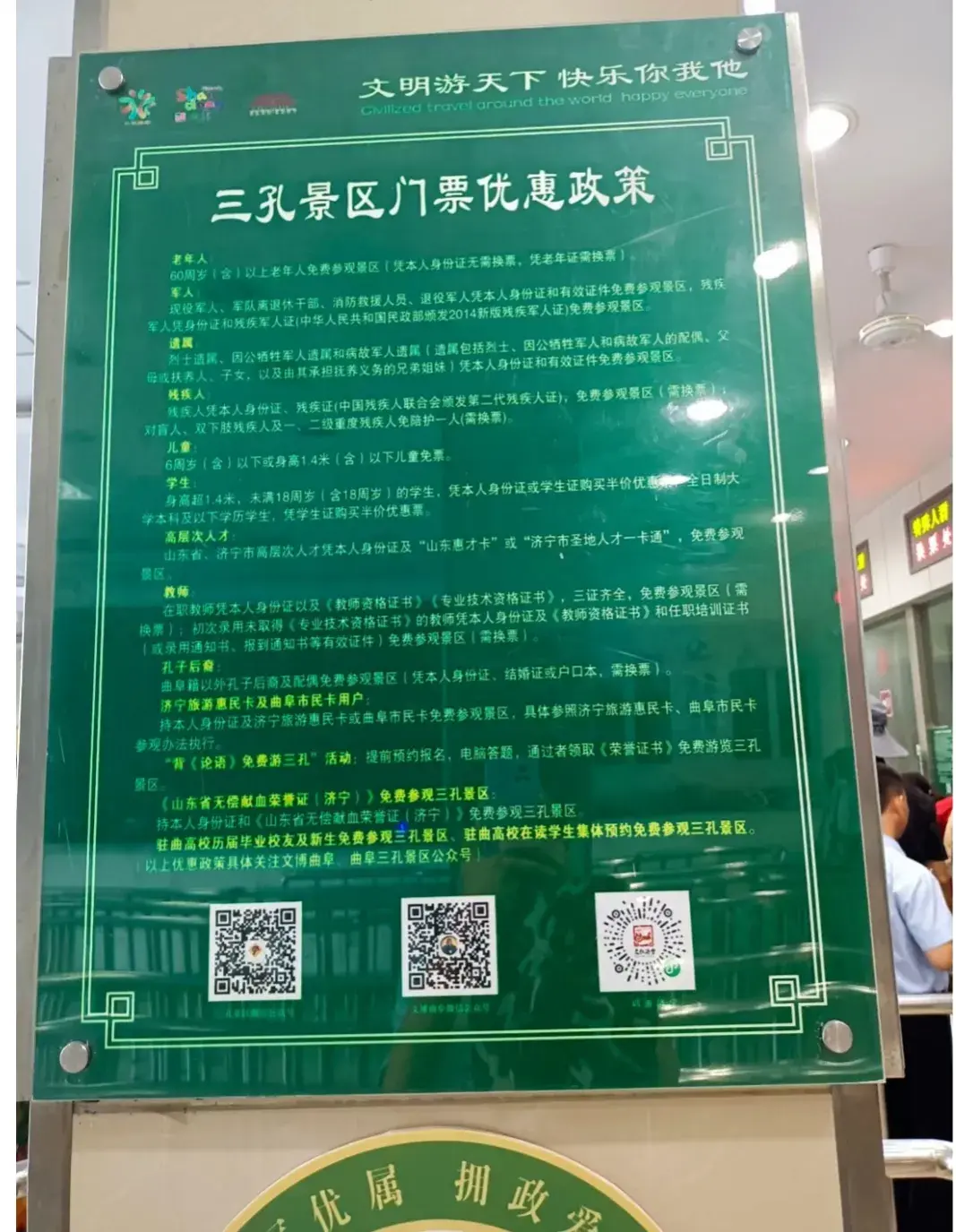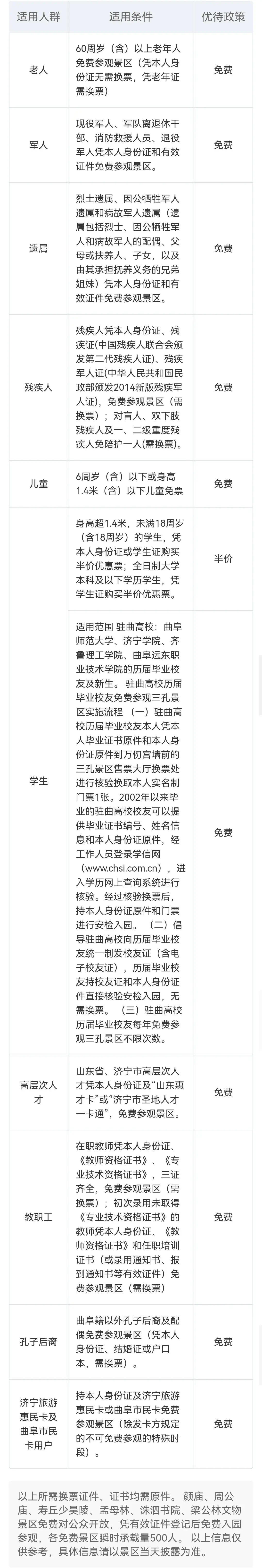 具体包括:残疾人,儿童,学生,高层次人,教职工,孔子后裔,济宁旅游,惠民卡及,曲阜市民卡用户等9类人员免首道门票。