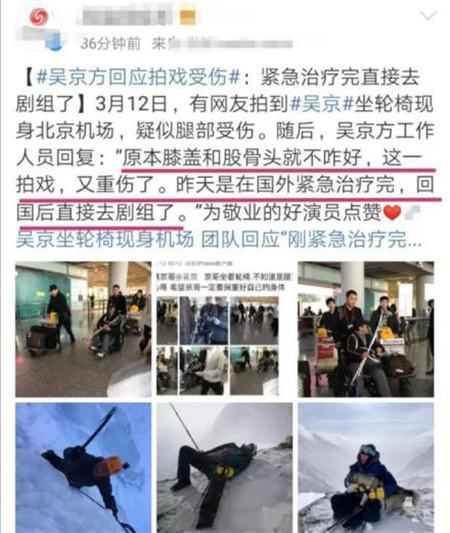 在事后吴京方工作人员回复:吴京原本的膝盖和股骨头本来就不是很好他在雪地那边拍戏,而且又受了重伤,他在昨天去国外紧急治疗完,然后回国就直接回剧组去了。吴京如此的敬业是一位好演员点赞。