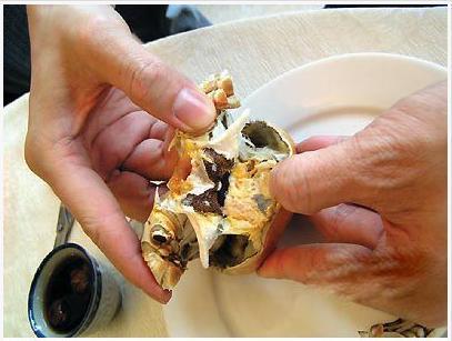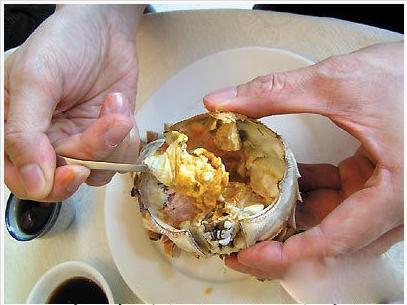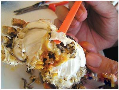 先吃蟹盖部分,用小勺把中间的蟹胃部分舀出,轻轻将外面包裹着的蟹黄吮干净。注意,不要吮破中间那个呈三角锥形的蟹胃,应将其丢弃;