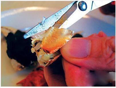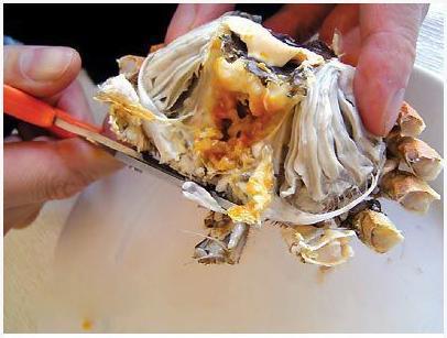 吃完蟹盖轮到蟹身,先用剪刀将多余的蟹脚、蟹嘴和蟹肺剪掉