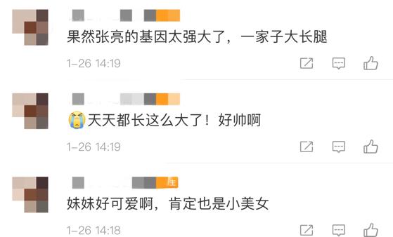 网友们在看到两个小朋友的近照后,有人评论:"果然张亮的基因太强大了,一家子大长腿。"还有人夸赞:"妹妹好可爱啊,肯定也是小美女。""天天都长这么大了!好帅啊。"