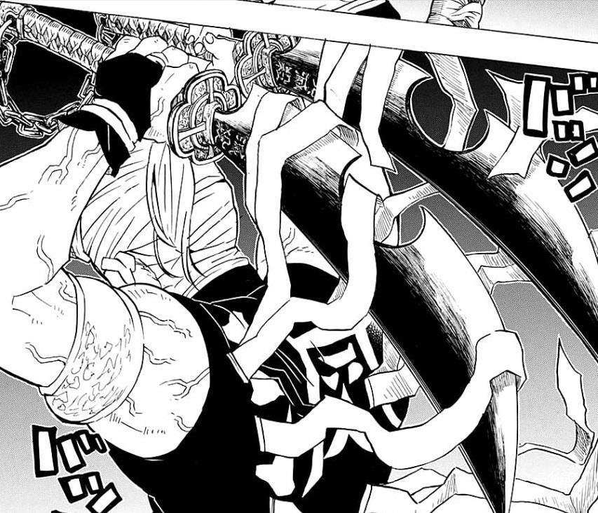 宇髄天元的日轮刀,是两把锁链相互连接的双刀,刀柄为赤色,刀锷为金色,刀身粗短并有缺口。