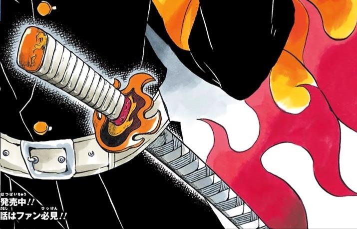 杏寿郎的日轮刀,刀身上有火焰刃纹。刀鞘、刀柄均为白色,火焰型的刀锷最后作为遗物留给了主人公炭治郎。