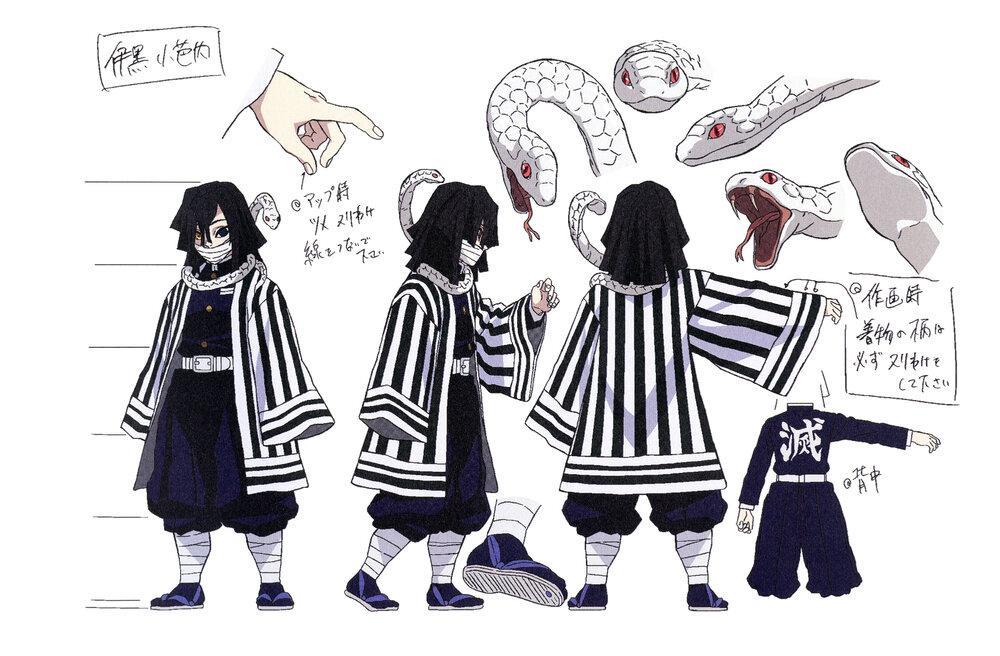 外形上,绷带缠住嘴巴,脖子上常年缠绕着一条小白蛇,身穿条纹状外褂。在和无惨的最终决战中,因伤势过重和甘露寺蜜璃一同阵亡。