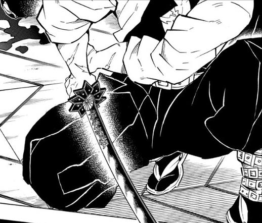 小芭内的日轮刀为弯曲的蛇形双面刃,刀身为紫色,圆形的刀锷内雕刻着蛇形纹案