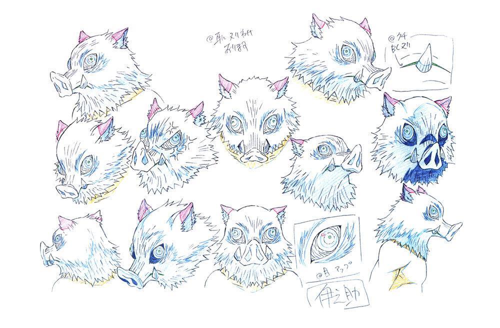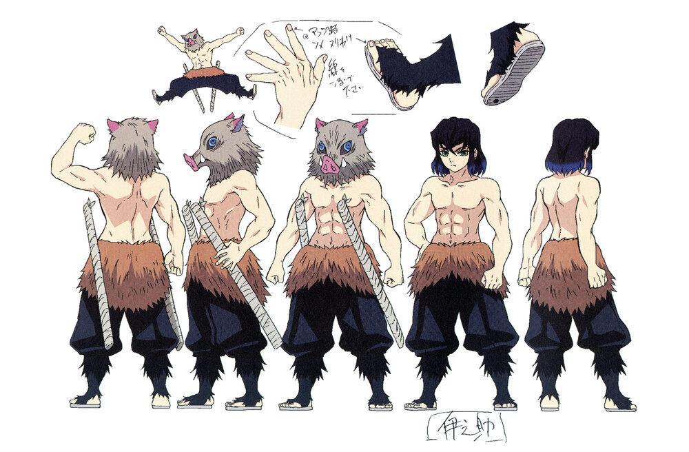 伊之助外形上,设计为赤裸上半身的野蛮小子,虽然戴着野猪头套,其实头套下面却有着一张漂亮的脸。