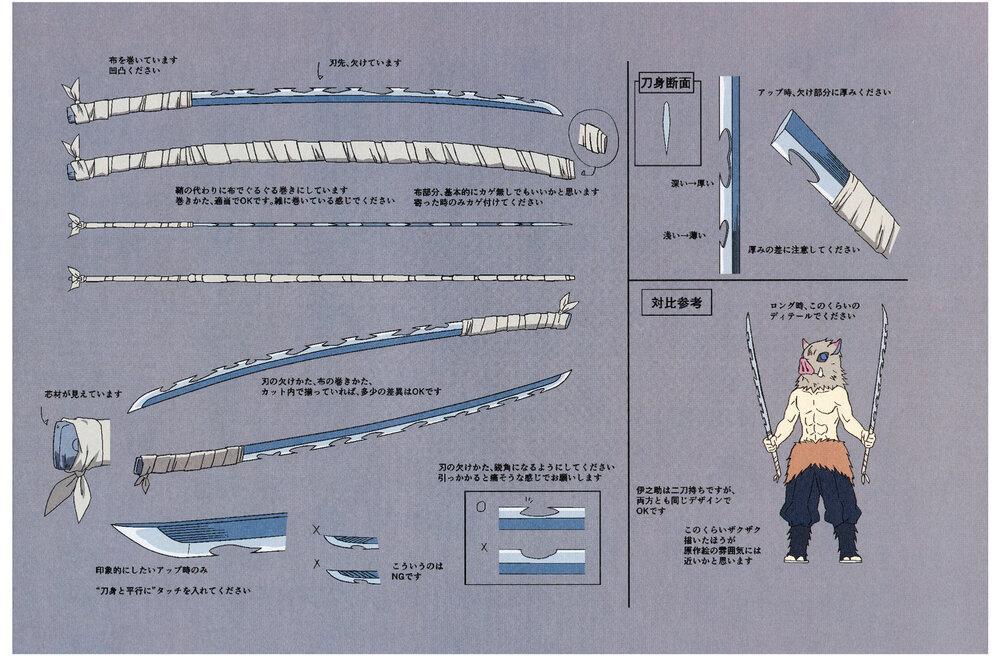 伊之助擅长使用兽之呼吸法,有着非常敏锐的触觉。武器是两把长刀,属于二刀流。但是刀刃部分被他砸得非常不平整,刀柄部分被布带所缠绕。