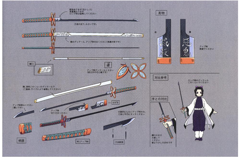 蝴蝶忍的日轮刀设计,刀尖有倒钩,刀鞘为白色,刀柄为绿色,刀锷为四叶形。刀身两侧,分别刻有“恶鬼”与“灭杀”字样。 刀内可以储存毒素 。