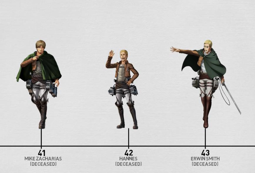 米克是调查兵团分队长,实力极为强大;汉尼斯则是驻扎兵团的一位队长,虽然有和巨人战斗的决心,但是缺乏勇气;最后是调查兵团第13代团长艾尔文。3人的年龄都在40岁左右。