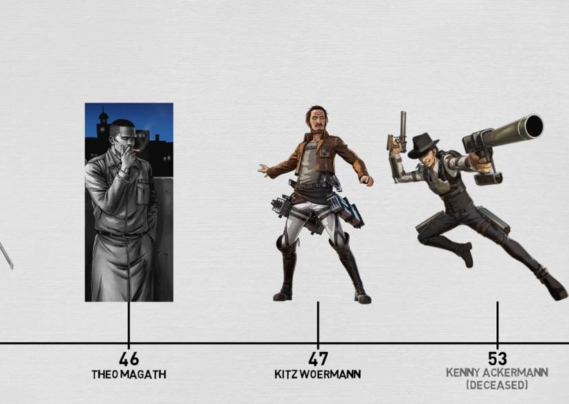 迪奥·马加特是马莱的陆军上将;奇兹·威尔曼是驻屯兵团队长,在危急情况下容易丧失理智;最后是利威尔的舅舅肯尼,实力极为强大。三人的年龄差不多都在50岁左右。
