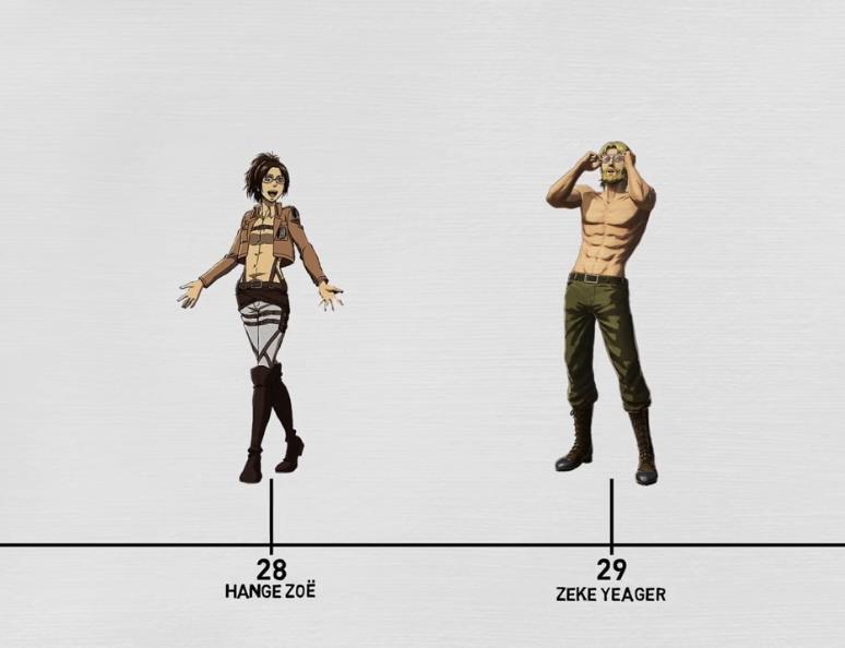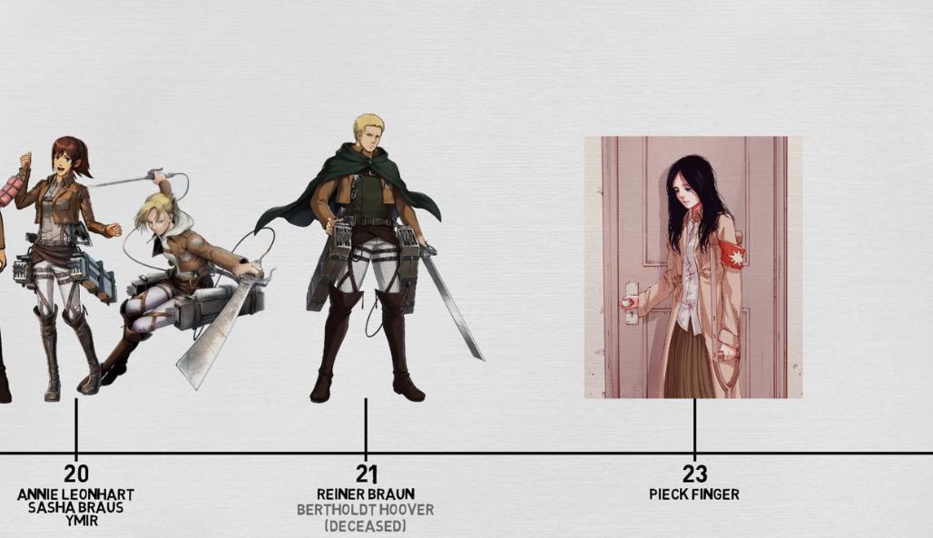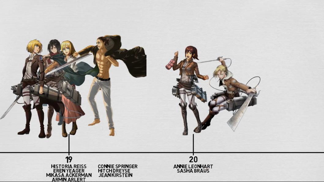 这一队角色中,萨莎和阿尼的年龄最长,双双进入20岁,但阿尼在水晶中沉睡了4年之久,虽然年龄已过20岁,但实际上只有16岁;萨莎在突袭马莱的行动中壮烈牺牲,永远停留在20岁。
