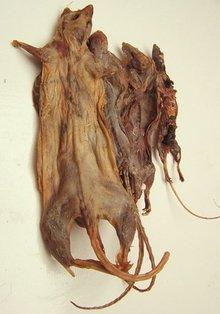 田鼠干的加工制作方法首先是去毛,把捕获的老鼠或架于锅内热水蒸,或放入炽热柴灰里焙,只要火候掌握告诫,便可把鼠毛拔得一干二净。其次是剖腹去其肠肚,用水洗干净。最后用谷壳或米糠熏烤,待烤成酱黄色即可。田鼠干不但美味可口,而且含蛋白质高,营养丰富。尤有补肾之功,对尿频或小孩尿床症具有显著疗效,故有一定的药用价值。