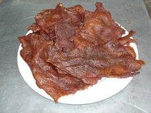 明溪肉脯干是用猪后腿精肉浸腌于面制的酱油中,加以丁香、茴香、桂皮、糖等配料,经一周左右,再挂在通风处晾干,然后放入烤房熏烤而成。制成后色、香、味俱佳,既有韧性又易嚼松,入口香甜,其味无穷。