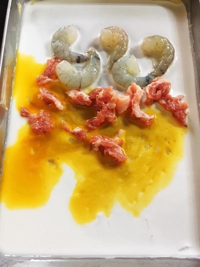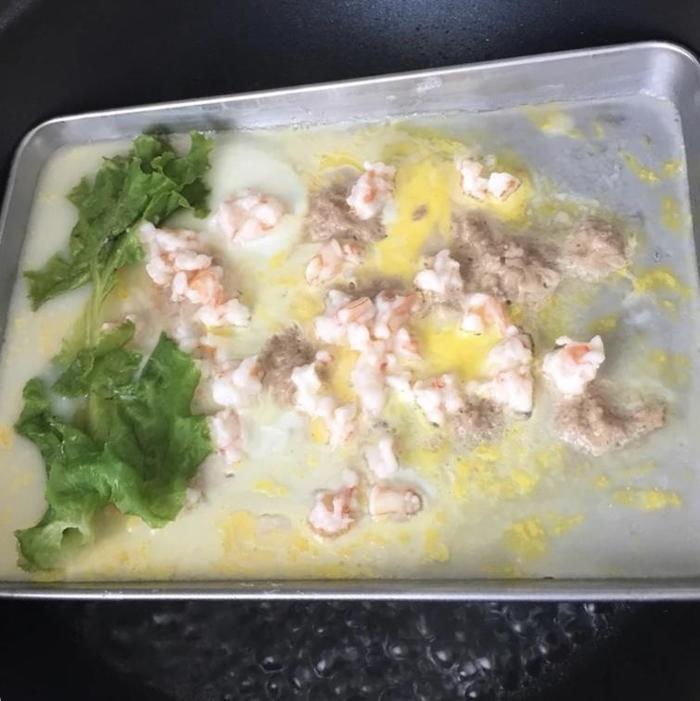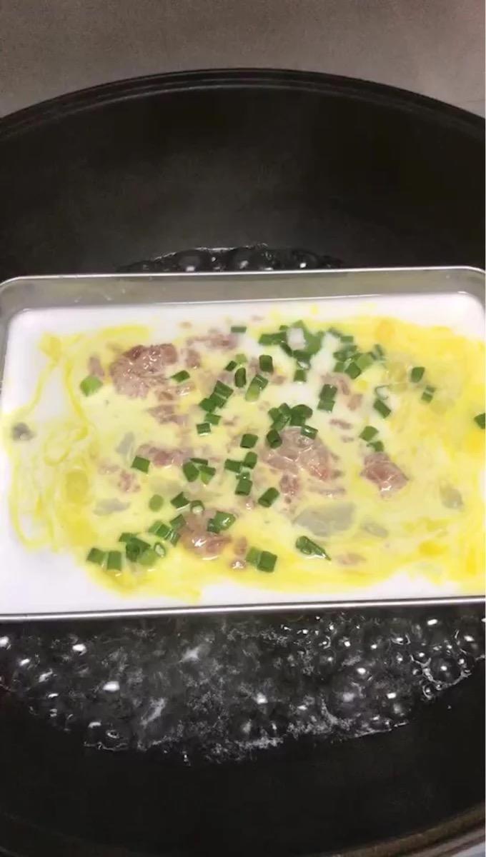 4、放的肉要剁碎或切薄,鸡蛋直接打在蒸盘上的粉浆里搅匀即可,青菜放易熟的。