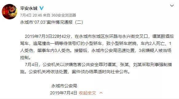 2019年7月3日22时42分,在永城市东城区东环路与永兴街交叉口,谭某醉酒后驾车,追尾撞击一辆等待信号灯的小型轿车,致小型轿车燃烧,车内2人死亡、1人受伤,肇事车内3人受伤。接警后,永城市公安局迅速处置,3名嫌疑人被当场控制。