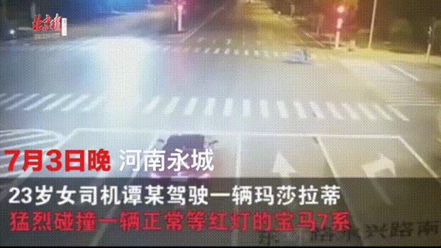 7月3日,在河南商丘,23岁女子谭某醉驾玛萨拉蒂途中,追尾撞击一辆等待信号灯的宝马轿车,宝马车被撞出数十米,瞬间燃烧成火球。