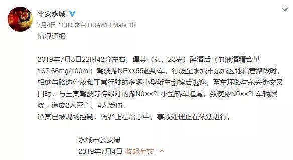 2019年7月3日22时42分左右,谭某(女,23岁)醉酒后(血液酒精含量167.66mg/100ml)驾驶豫NE 55越野车,行驶至永城市东城区地税巷路段时,相继与路边停放和正常行驶的多辆小型轿车刮擦后逃逸,至东环路与永兴街交叉口时,与王某驾驶等待绿灯的豫N0 2L小型轿车追尾,致使豫N0 2L车辆燃烧,造成2人死亡、4人受伤。