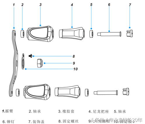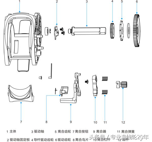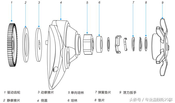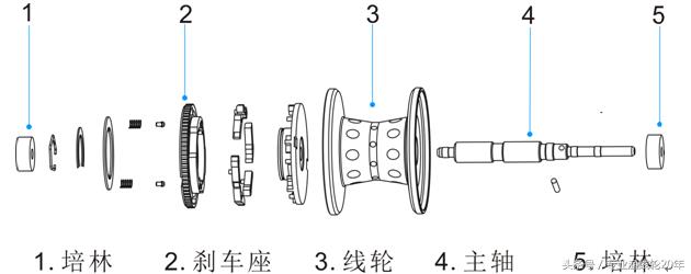水滴轮主要由(1,摇臂部分 2,线轮部分 3,刹车部分 4,离合部分 5,主体部分 6,阻尼部分 7,排线部分 8,传到部分)组成。