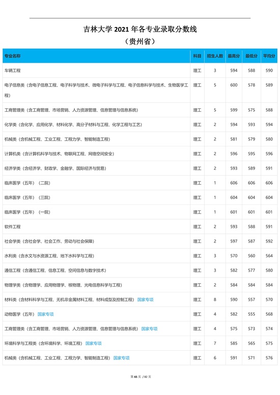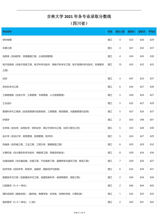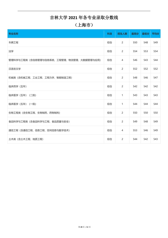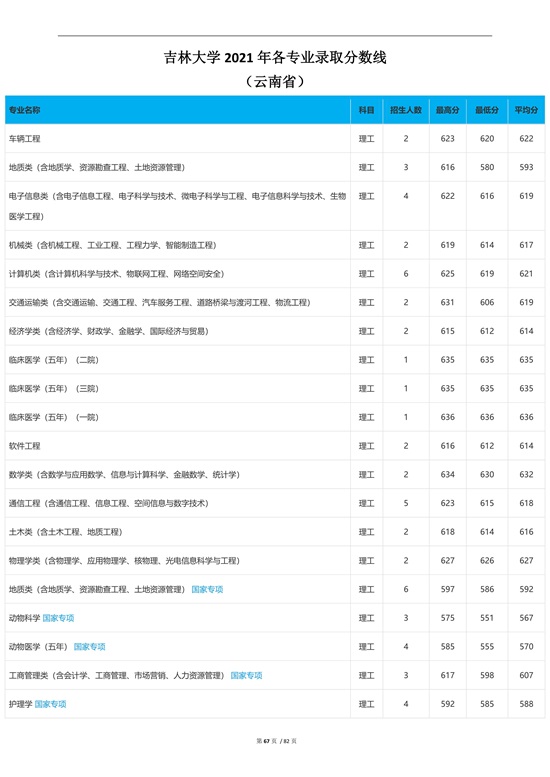 吉林大学2021年在各省市本科招生的专业录取分数线如下: