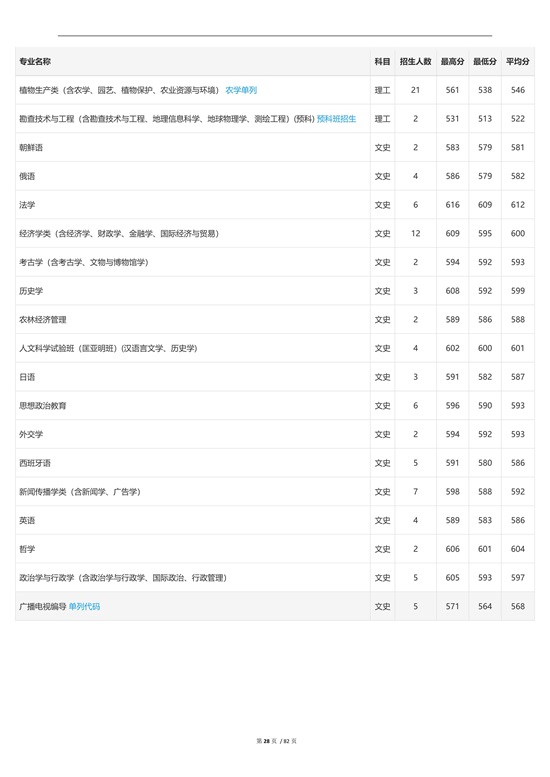 考古学(含考古学、文物与博物馆学)专业的录取分数线最高,录取最低分为615分。日语专业的录取分数线最低,录取最低分为605分。