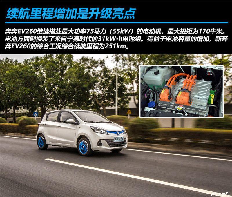 奔奔EV260继续搭载最大功率75马力(55kW)的电动机,最大扭矩为170牛米。电池方面则换装了来自宁德时代的31kW·h电池组。得益于电池容量的增加,新奔奔EV260的综合工况综合续航里程为251km。车头车标位置的是快充接口,在充电桩直流快充下半个小时可以充满电量的80%。传统的油箱盖位置是交流慢充接口,在6-8小时可充满全部电量。