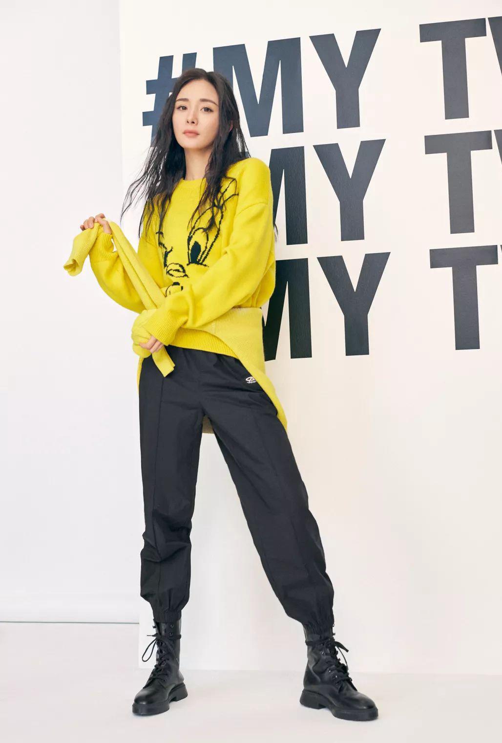 认为同色系搭配太单调不够吸睛,也可试下撞色搭配,若是针织衫的色彩过于明亮,也可用基础色系的束脚裤进行中和过渡,尽量避免太张扬,造型也有一定的视觉冲击力不会很平淡朴素,杨幂这身造型便是用姜黄色针织衫来搭配黑色束脚裤,清爽利落又时髦,印花元素的点缀提高造型的辨识度,套上马丁靴更飒。