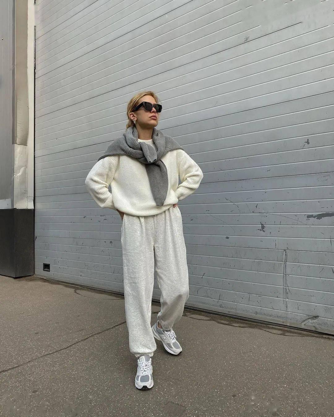 束脚裤的设计并不局限于单一的风格,只要裤脚为收缩设计都可称为束脚裤,设计上繁简皆有,根据个人的时尚驾驭力来选款就不易踩雷,设计越简单自然就越好驾驭,而搭配的上装风格也会影响整体穿搭的风格塑造,像针织衫+束脚裤就偏简约休闲风,柔软细腻的针织衫要比毛衣显瘦很多,暖和度也不低,搭配针织束脚裤简直慵懒舒适到骨子里,很轻松惬意。