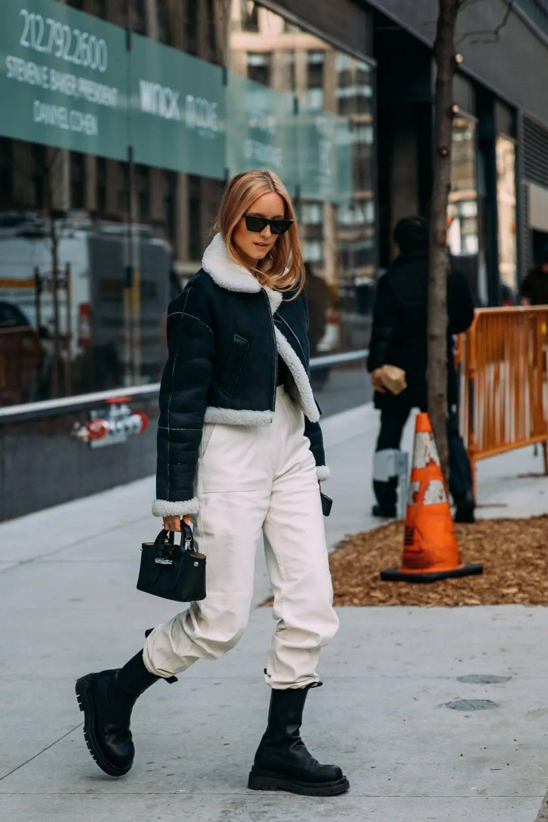 短外套是不像大衣那般防风御寒,但选择加绒款式保暖性也不差,还不用烦恼长衣摆拉低比例的问题,其次短外套即使面料很厚实也不易穿出厚重感,因为短衣摆设计增加造型的轻盈度,搭配高腰工装束脚裤穿出“胸以下全是腿”的既视感,身高150同样能凹出180的大长腿。