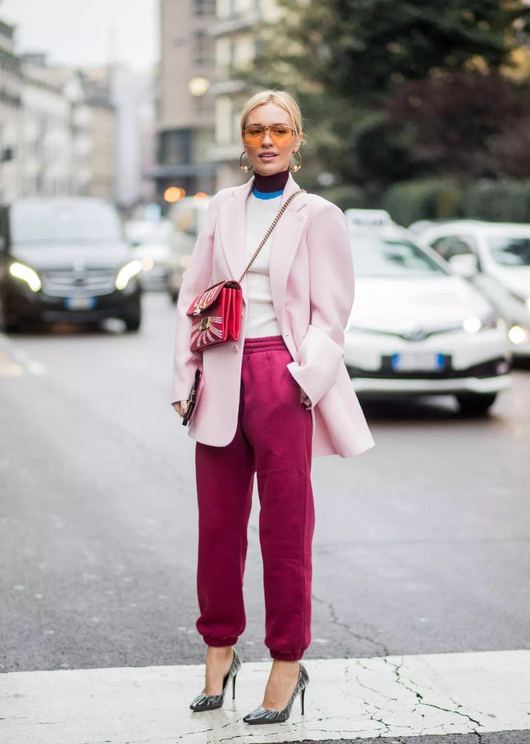 对色彩搭配很在行的女性,建议多考虑撞色搭配,只要色彩匹配得当不比同色系差,甚至更有视觉冲击力,既要有亮点又要避免违和感的话,可以从顺色系入手,比如这身淡粉色西装+玫红色运动束脚裤就挺甜美少女的,完全没有想象中那么另类怪异,清新的淡粉色并无刻意扮嫩的嫌疑,不同色彩饱和度的粉色搭配令造型变得更有层次感。