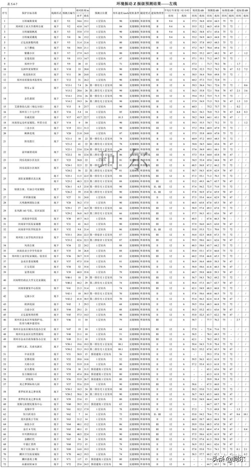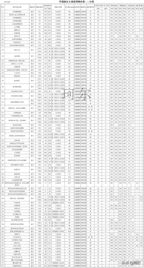 郑州地铁8号线一期工程涉及郑州市高新区、金水区、郑东新区、中牟县。工程沿线评价范围内有振动保护目标72处,其中住宅55处,幼儿园2处,学校7处,医院2处、办公(行政或科研)6处,根据沿线敏感点与轨道交通线路之间的相对位置关系以及工程技术条件、列车运行状况等因素,采用前述预测公式预测出敏感点处的Z振级,郑州地铁8号线一期工程沿线现状振动保护建筑物及预测结果如下表。