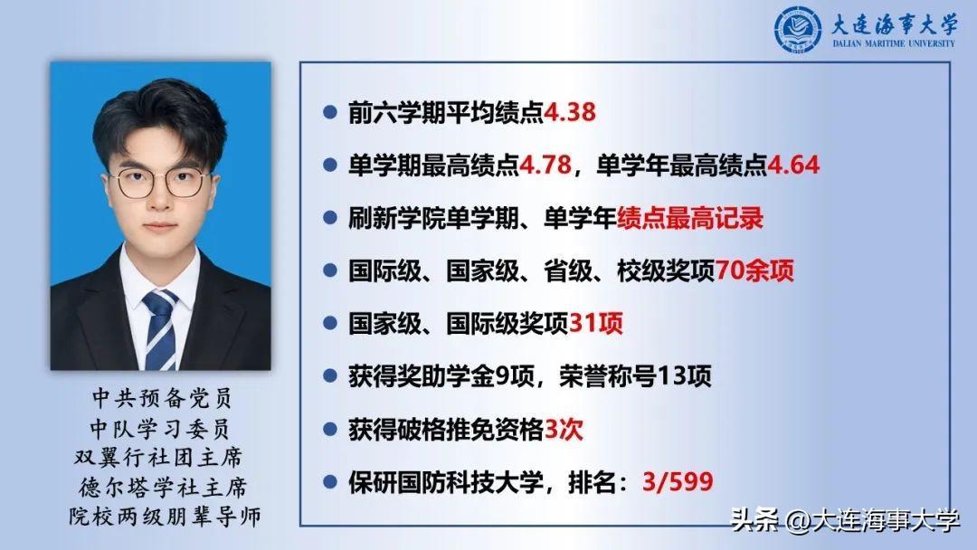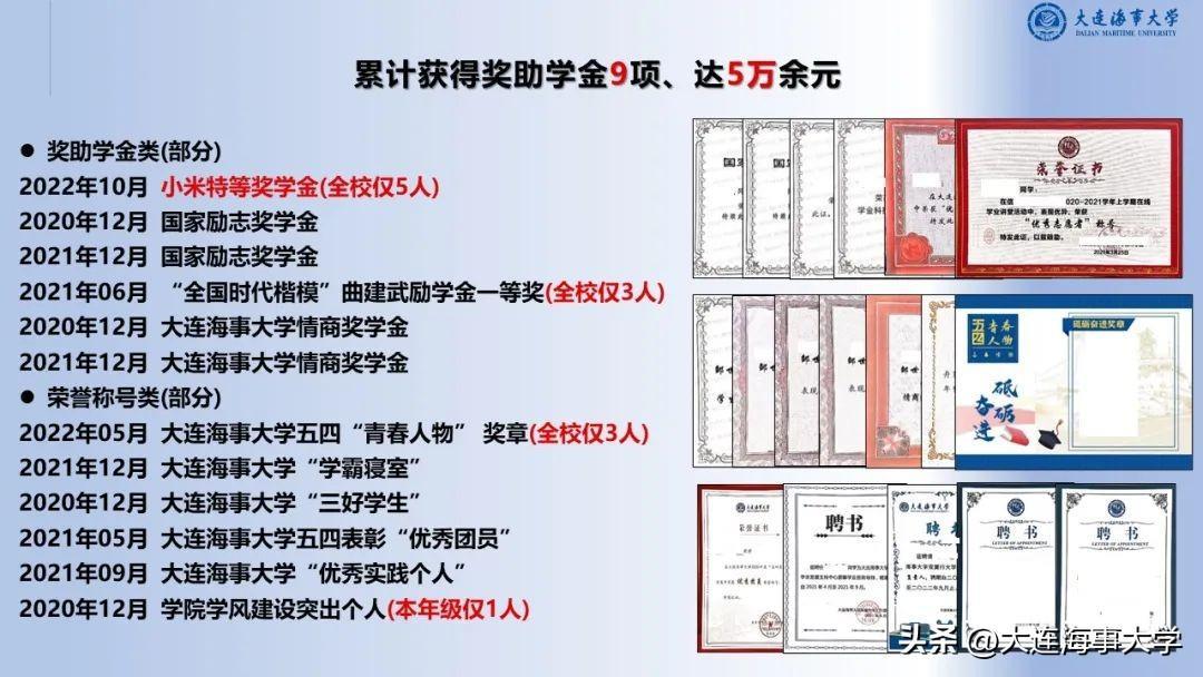 大连海事大学十佳大学生是学校本科生中的最高荣誉,获评该荣誉称号的同学同时获得校长奖学金。十佳大学生评选旨在选树优秀大学生典型,弘扬“学在海大”的优良学风,践行“学汇百川、德济四海”的海大校训,以评促学、以奖促优,让十佳大学生成为事迹可学可做、精神可追可及的榜样。