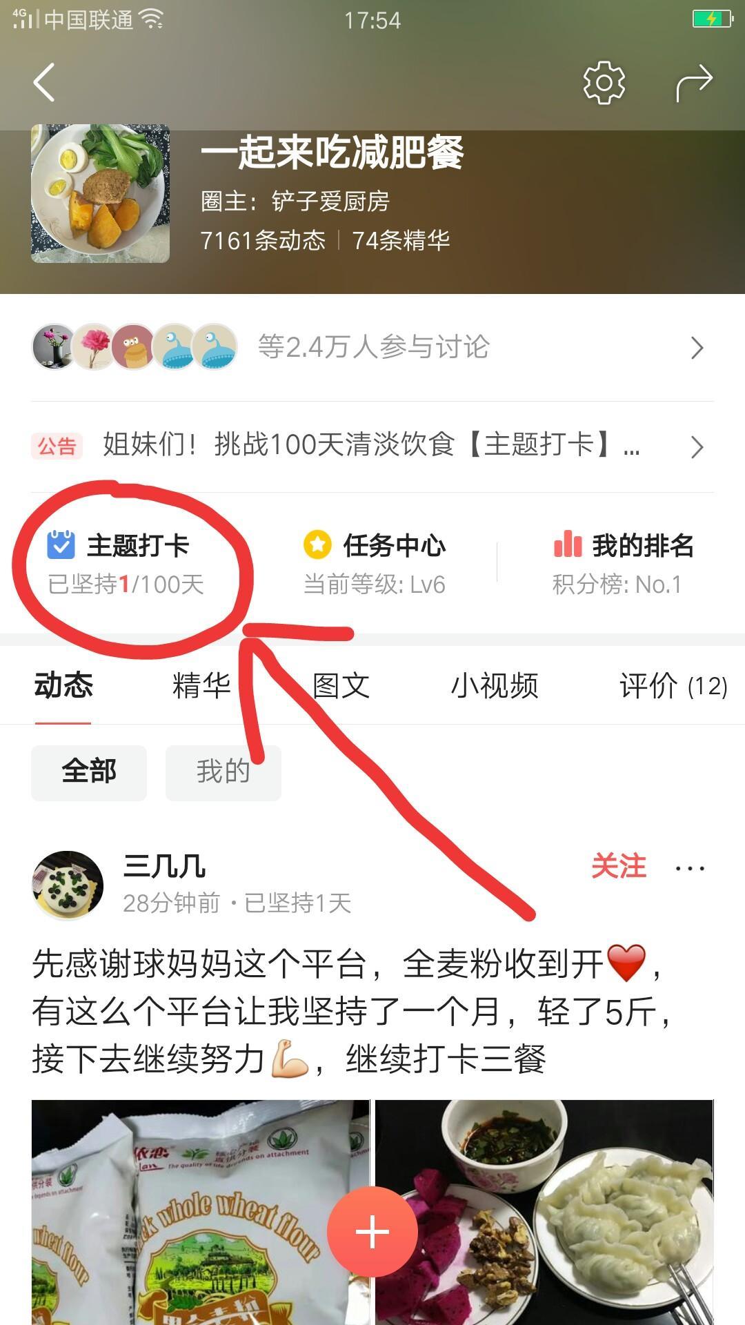 由于在坚持的过程中也有好多朋友想跟我一起来清淡饮食,所以我也在“一起来吃减肥餐”圈子里发起了【主题打卡】活动,主要是以清淡饮食为主,这一次大家都积极踊跃的想挑战100天,所以设置了100天的清淡饮食主题打卡,今天是第四轮的第一天,看到这条消息的朋友可以加入圈子,点击左上角的【主题打卡】来开始我们的清淡饮食打卡之旅,坚持100天以后,你就会形成一个很好的自律的习惯,慢慢的身体也就会越来越瘦,变得越来越美。