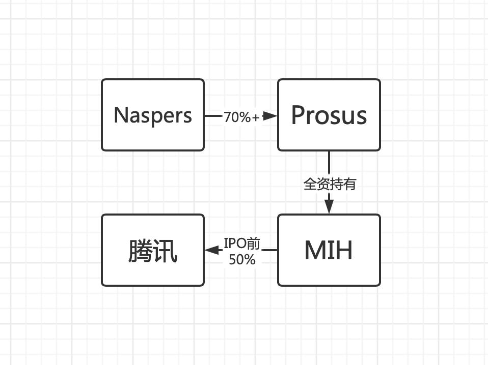 看到纳斯达克崩盘,加上腾讯当时烧钱也确实快,这两兄弟当时就慌了,恨不得马上把腾讯的股份抛了,可惜当时腾讯未上市,他们也无法脱手。这个时候呢,本期的主角出场了,也就是南非的MIH公司。网上传的腾讯股东有Naspers,Prosus,MIH,他们到底是啥关系呢,来一张图看明白,也就是直接持有腾讯股份的是MIH,Prosus全资持有MIH,Naspers持有70%以上的Prosus股份。