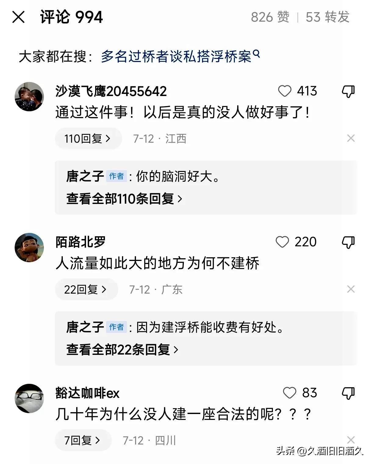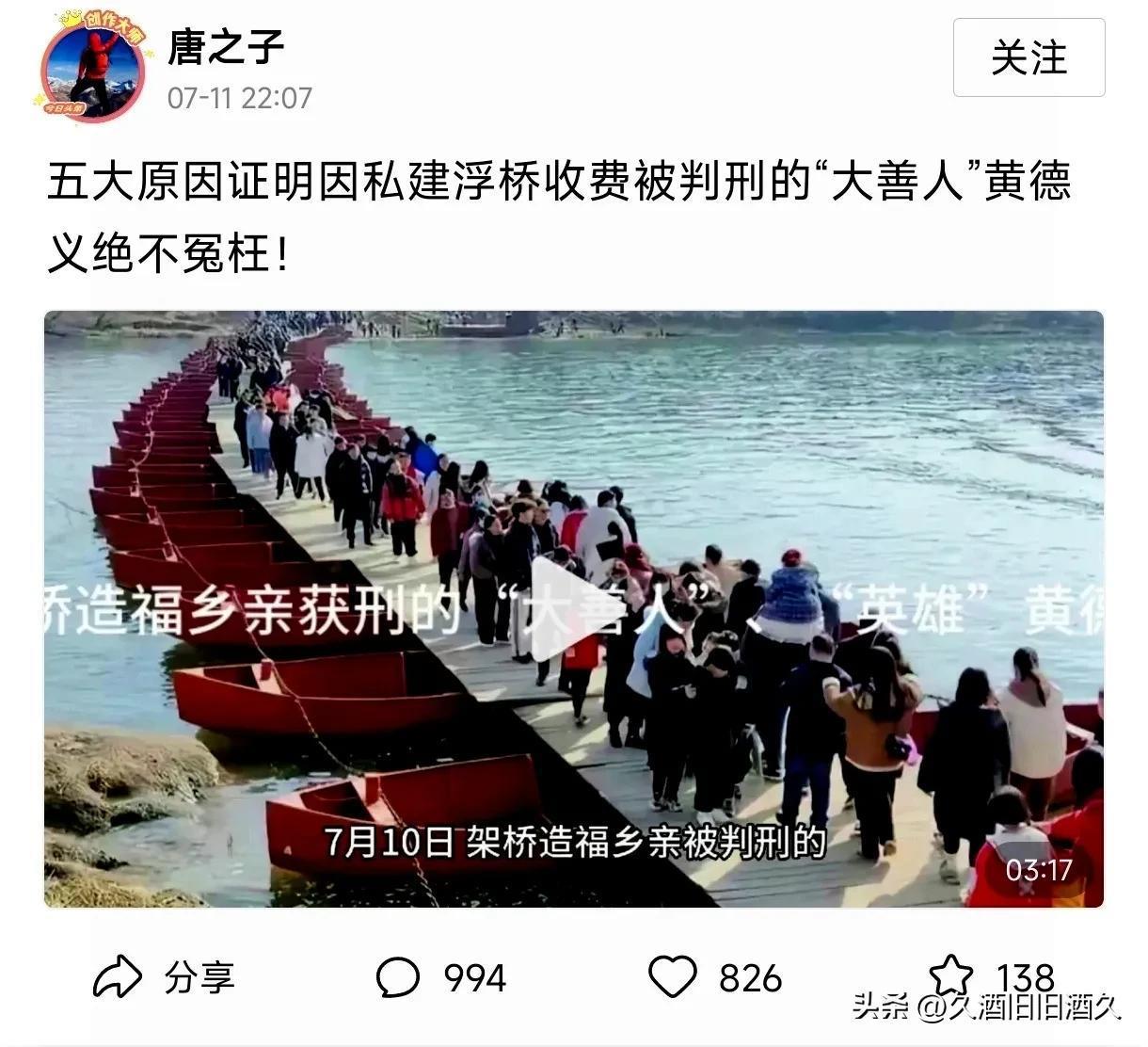 我们回看整个事件,由于有关部门的不能提供群众出行所需、这是首因;导致黄德义从善意出发,有了私建浮桥的行为。按道理来说这是为村民出行合法权益,被逼无奈的做法,造桥可以被理解。村民也由此也获得了实际出行的便利。