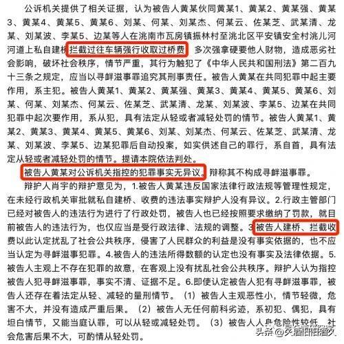 然而与2019年的黄德义所说不符。根据《洮南市人民法院刑事判决书》,公诉机关指控黄德义等人“私自建桥拦截过往车辆强行收取过桥费”,当时黄德义“对公诉机关指控的犯罪事实无异议”,只是认为自己的行为不构成寻衅滋事罪。甚至连黄德义自己请的辩护人都承认了被告存在“拦截收费”的行为。