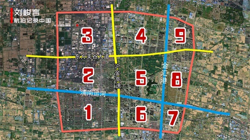有的人将这里描述成“奉贤新城九宫格”。即以金汇港、浦南运河和东方美谷大道、沪金高速为界,划分出来的九个相对独立的板块。