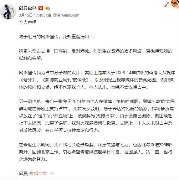 3月15日,因疑似发表不当言论被网友手撕后,邱晨曾发微博澄清:“网络谣传我为占中分子做的设计,实际上是本人于2008-14年供职的香港大众媒体《号外》、《彭博商业周刊/繁体版》、以及阳光卫视等媒体的新闻配图。供职媒体的倾向和立场,绝不代表我个人。本人从未,也绝不会支持占中。”邱晨还强调:“在香港生活期间,我目睹社会逐步撕裂,深感失望与无力,也因此最终选择辞职离开,回到北京工作。衷心希望香港风波能早日平息,祖国强大,我一直、也将永远为此努力。”