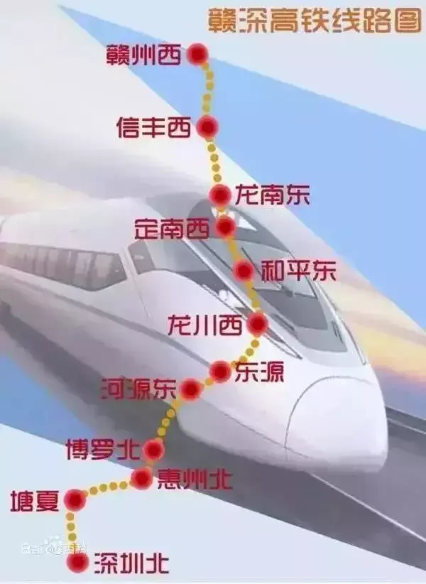 赣深铁路为京九高铁的最南段,横跨江西、广东两省,北起江西省赣州市赣州西站,向南途经广东省河源、惠州、东莞、深圳五市,于深圳市接入终点深圳北站,正线全长436.37公里。赣深铁路设计时速为350公里,计划于2021年建成通车,将结束河源不通高铁的历史,深圳至赣州的时间将由现在接近7小时压缩到2小时,河源到深圳时间也将压缩至1小时内,加快融入粤港澳大湾区,实现广东“市市通高铁”目标。