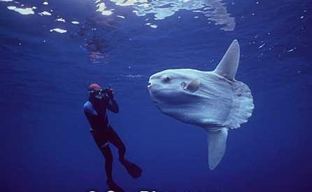 翻车鱼是世界上最大、形状最奇特的鱼之一。它们的身体又圆又扁,像个大碟子。鱼身和鱼腹上各有一个长而尖的鳍,而尾鳍却几乎不存在,于是使它们看上去好像后面被削去了一块似的。翻车鱼主要以水母为食,用微小的嘴巴将食物铲起。它们常常在水面晒太阳,尽管其形状笨拙,但有时也会跃出水面。