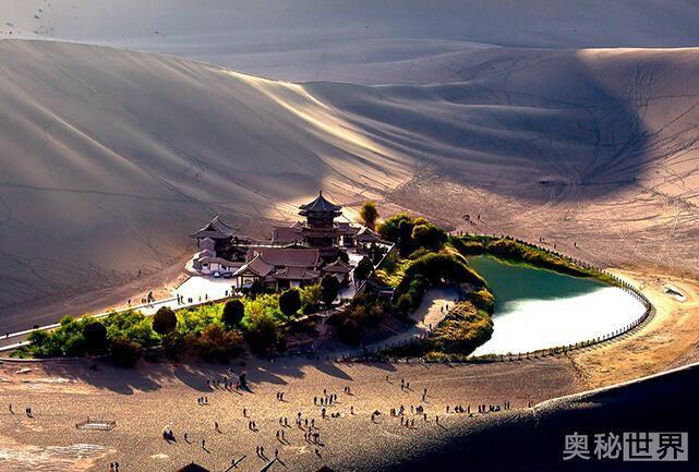 位于敦煌城南7公里的鸣沙山北麓的月牙泉,古称沙井,俗名药泉,自汉朝起即为“敦煌八景”之一,因“亘古沙不填泉,泉不涸竭”而成为奇观。其南北长近100米,东西宽约25米,泉水东深西浅,弯曲如新月。坊间流传,月牙泉有“三宝”:铁背鱼、七星草、五色沙。