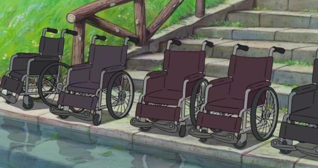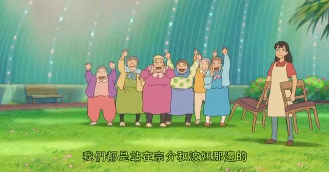 看到几部轮椅,让观众联想到以为悲剧发生了。原来养老院被魔法笼罩起来了,每个人的病痛还好了呢!大家毫发无损的在开心聊天,是波妞的父亲救了她们,还让她们当做这次爱之试炼的见证人,个个都可兴奋了。