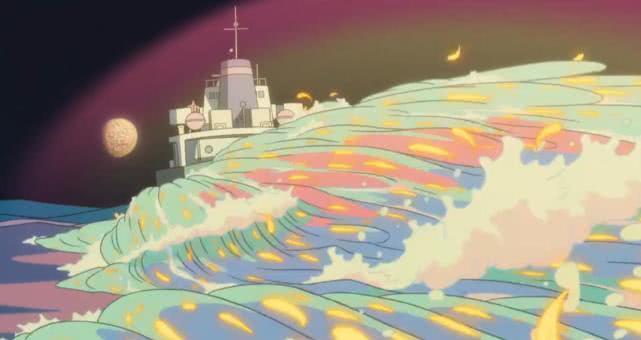 开场就是波妞的父亲用奇妙的药水孕育出了很多水母一样的海洋生物,让水里充满生机勃勃气象,也幻化出五彩斑斓的景象。这个时候波妞趁乱逃走,跟妹妹们告别后就开始独自一人的旅行。