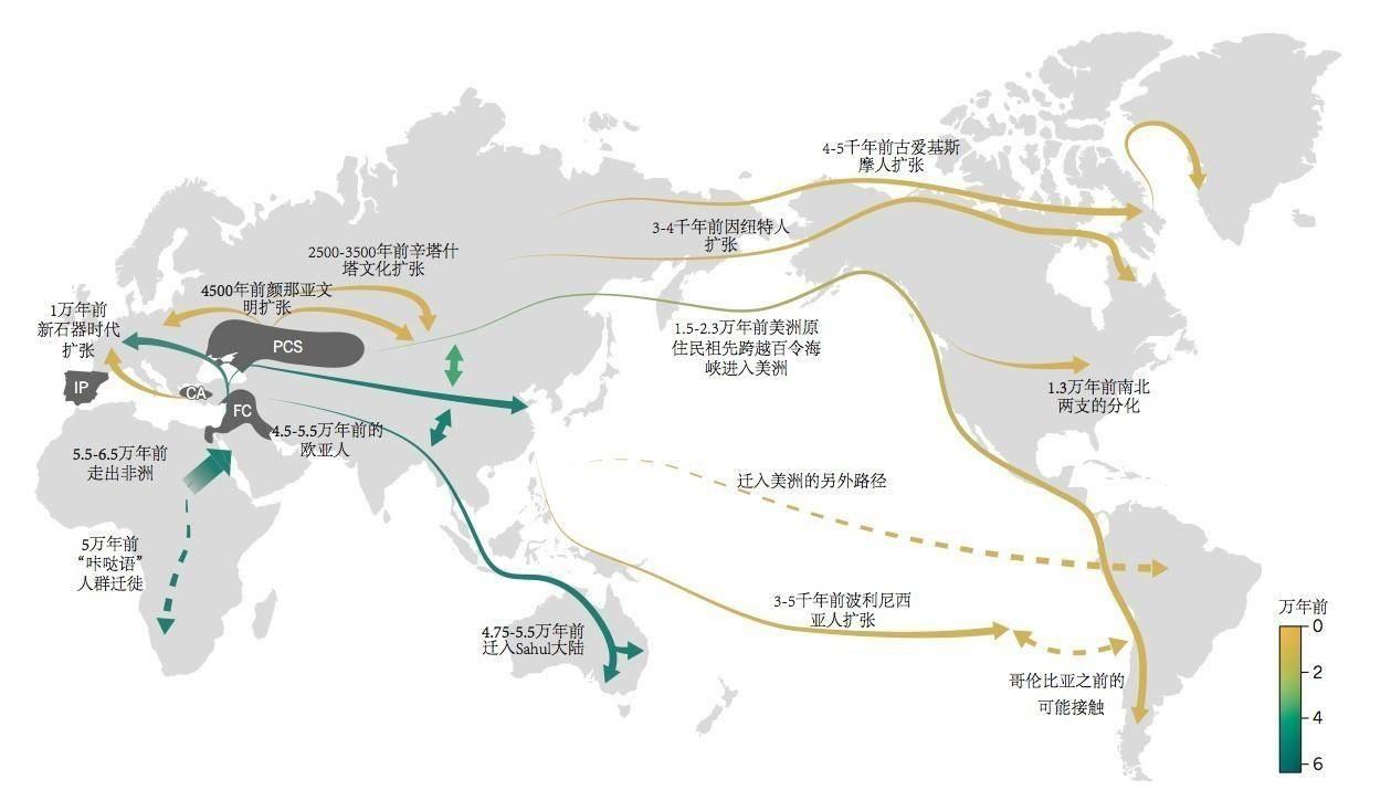 这一迁徙过程涉及到跨大陆的移动,如通过陆桥到达澳大利亚,以及通过航海技术到达美洲。