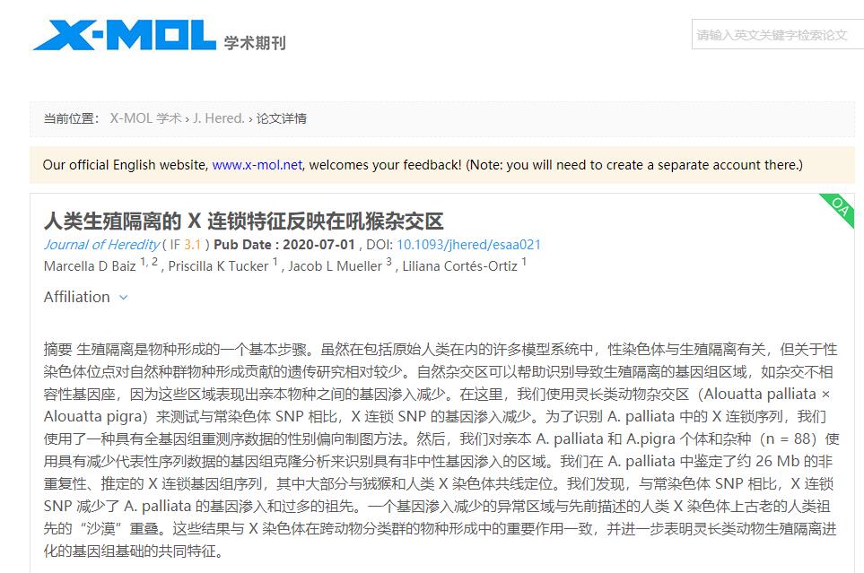 学术期刊X-MOL——人类生殖隔离的 x连锁特征反映在吼猴杂交区