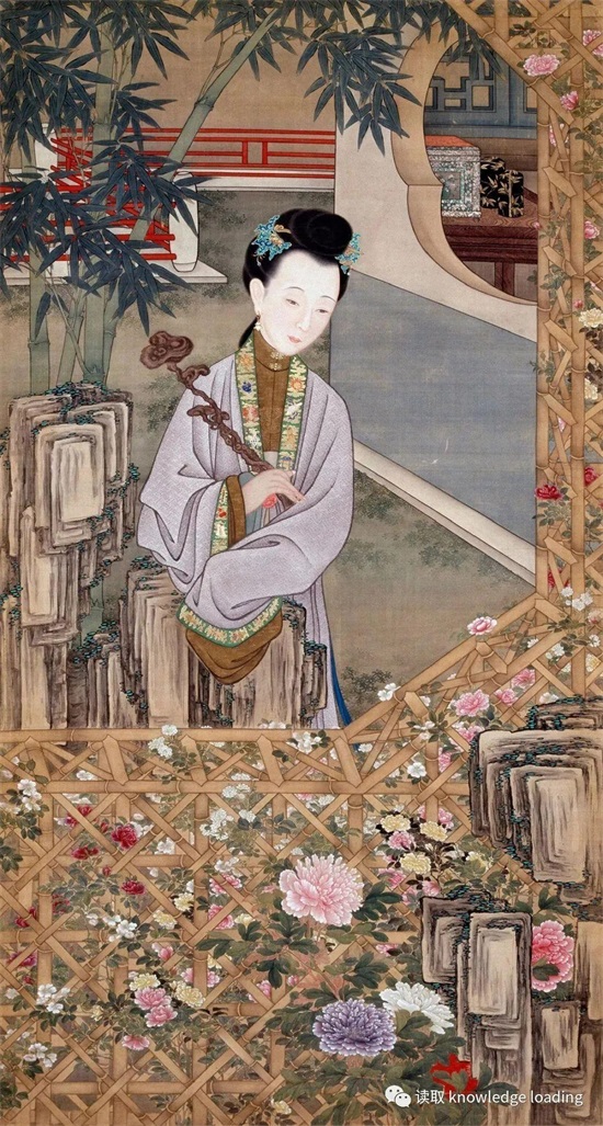 仕女手持如意,立于庭院内赏花。前方的竹篱上缠绕蔓延着各色牡丹,繁花似锦,花团锦簇。画家着重突出了紫、粉、白、红等各色牡丹。牡丹以雍容华丽、香味浓郁而被称作“百花之王”,并成为吉祥富贵、繁荣昌盛的象征。结合女子手中所持的竹雕灵芝如意,蕴含了“富贵如意”的美好愿望。梳妆盒也很有特色,有黑底描金和花边两种。