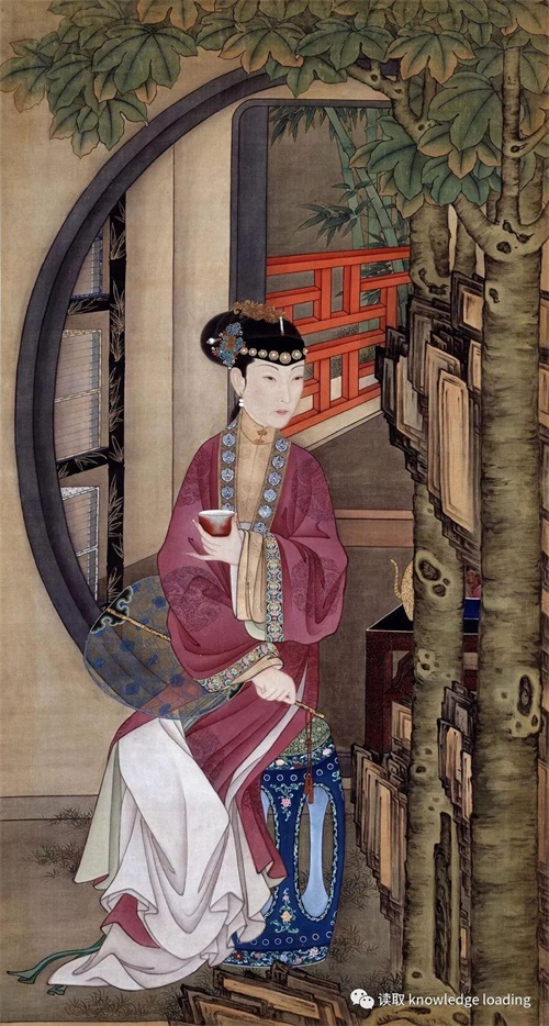 仕女手持薄纱纨扇,坐于茂密的梧桐树下静心品茶。右手握着湘妃竹柄梅花冰裂纹纱团扇,坐在宝蓝釉画珐琅开光坐墩上,左手手持郎窑红釉杯,月亮门后陈设有黑漆描金书架,书架里摆放整齐的线装书,不仅为画面增添了儒雅的书香气息,而且与仕女手中的茶具相互映衬,表现出宫中女子的文化修养。美人的身边放着一个小茶几,被假山和梧桐树干挡住,透过树干隐约可以看到放在后面的梅竹纹执壶,执壶的旁边就放着一个祭蓝釉盘,隐约可以看到蜜桃两个,荔枝数颗,都是应季的消夏瓜果。